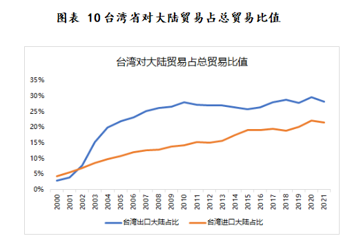 在經(jīng)濟領域,從臺灣省和大陸的進出口貿(mào)易比值來看,臺灣省對大陸進出口貿(mào)易占比呈現(xiàn)逐漸上升走勢,且臺灣省與大陸貿(mào)易聯(lián)系日漸緊密。2021年臺灣省出口大陸地區(qū)貨品金額為1259億美元,占臺灣省總出口金額28.2%;臺灣省進口大陸地區(qū)貨品金額為825億美元,占臺灣省總金額21.6%。