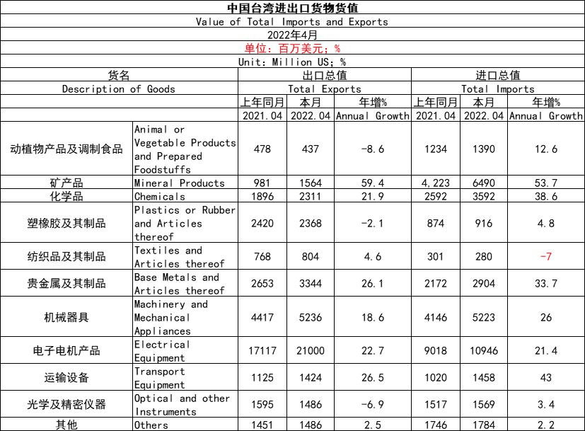 中國臺灣進出口產(chǎn)品涉及到礦產(chǎn)品、化學品、塑橡膠及其制品、紡織及其制品,以及電子、奠基、機械、運輸、精密儀器等。以今年4月數(shù)據(jù)來看,臺灣出口方面,電子電機產(chǎn)品當月出口總值為21000百萬美元,年增22.7%;礦產(chǎn)品、化學品塑橡膠及其制品、貴金屬及其制品、機械器具等出口總值較高。臺灣進口方面,電子電機產(chǎn)品當月進口總值為10946百萬美元,年增21.4%;礦產(chǎn)品、化學品等進口總值較高。