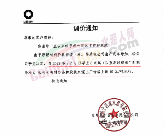 水泥人網(wǎng)通訊員消息,日前貴州威寧西南水泥有限公司通知,由于原燃材料價(jià)格持續(xù)上漲,導(dǎo)致公司生產(chǎn)成本增加,經(jīng)公司研究決定,自8月8日早上8點(diǎn)起,對各品種袋裝水泥出廠價(jià)格上調(diào)10元/噸。