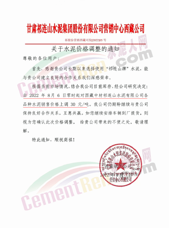 日前祁連山水泥集團(tuán)西藏公司通知,根據(jù)當(dāng)前市場情況,結(jié)合公司目前庫存,經(jīng)公司研究決定自8月6日零時(shí)起對西藏中材祁連山水泥有限公司各品種水泥銷售價(jià)格上調(diào)30元/噸。調(diào)價(jià)后如繼續(xù)安排車輛到廠提貨,則視為確認(rèn)本次調(diào)價(jià)。