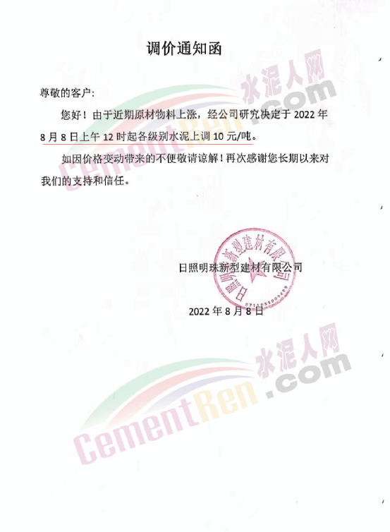 日照明珠新型建材有限公司通知,由于近期原材物料上漲,經(jīng)公司研究決定于8月月8日上午12時(shí)起各級別水泥上調(diào)10元/噸。