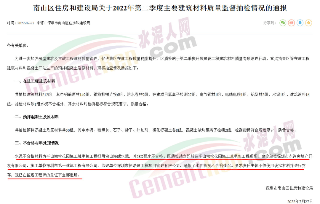 水泥不合格材料為半山港灣花園施工總承包工程擬用佛山海螺水泥,其28D強(qiáng)度不合格。區(qū)質(zhì)檢站立即前往半山港灣花園施工總承包工程現(xiàn)場,建設(shè)單位深圳市赤灣房地產(chǎn)開發(fā)有限公司,施工單位深圳市第一建筑工程有限公司,監(jiān)理單位深圳市恒浩建工程項目管理有限公司,通報了水泥檢測不合格情況。要求責(zé)任主體不得使用該批材料并進(jìn)行封存,現(xiàn)已在監(jiān)理工程師的見證下全部退場。