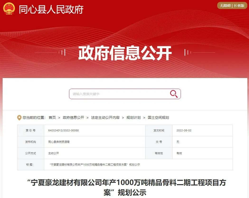 近日,同心縣自然資源局公示寧夏豪龍建材有限公司年產1000萬噸精品骨料二期工程項目方案規劃。