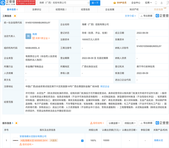 企查查APP顯示,8月9日,海螺(廣西)控股有限公司成立,法定代表人為陶勇,注冊資本1億元人民幣,經(jīng)營范圍包含:水泥制品制造;新型建筑材料制造(不含危險化學品);輕質(zhì)建筑材料制造;煤炭及制品銷售等。企查查股權(quán)穿透顯示,該公司由海螺水泥100%控股。