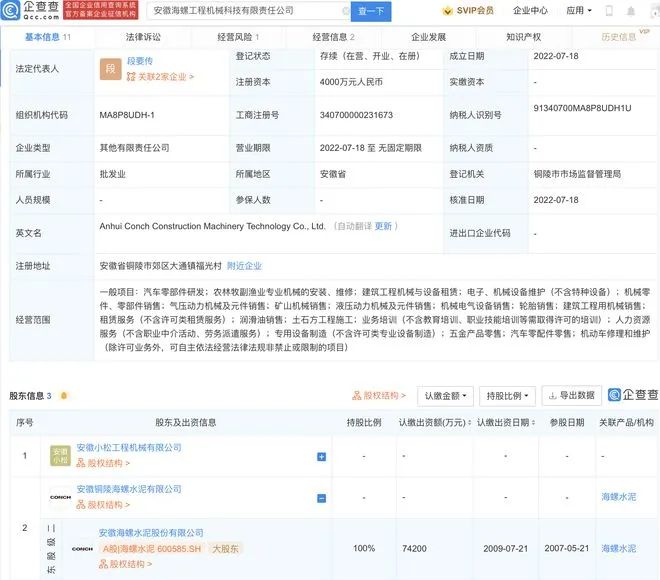 據(jù)查詢,集團集團旗下近日還新增了一家名為安徽海螺工程機械科技有限責任公司的企業(yè),法定代表人為段要傳,成立日期為2022年7月18日,注冊資本4000萬元人民幣,經(jīng)營范圍包含:汽車零部件研發(fā);農(nóng)林牧副漁業(yè)專業(yè)機械的安裝、維修;氣壓動力機械及元件銷售;礦山機械銷售等。企查查股權(quán)穿透顯示,該公司由海螺水泥全資子公司安徽銅陵海螺水泥有限公司等共同持股。