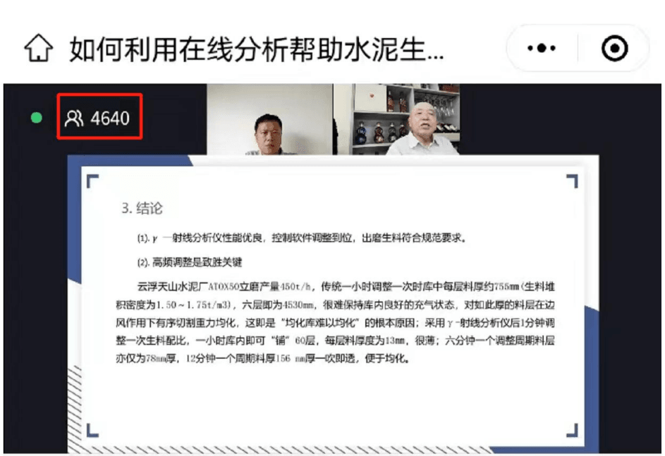 本次直播特邀賽默飛技術應用及銷售經理蔣山為大家帶來賽默飛在線分析技術講解,解答水泥廠在水泥生料生產控制儀器中的所面臨的各類問題。同時還邀請了在線分析高頻調整取代預均化堆場技術的主要發明者、原天津水泥工業設計研究院沈欣老師講解分析儀應用案例及相關技術應用。本次直播活動累計觀看人數4375人次,進入直播間總人次達4640人。