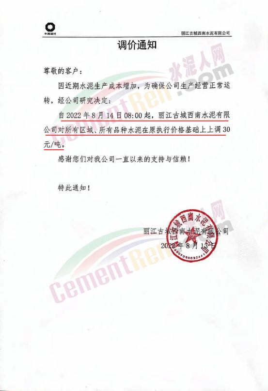 日前,麗江古城西南水泥有限公司通知,因近期水泥生產(chǎn)成本增加,為確保公司生產(chǎn)經(jīng)營正常運轉(zhuǎn),經(jīng)公司研究決定,自8月14日8時起,公司對所有區(qū)域、所有品種水泥在原執(zhí)行價格基礎(chǔ)上上調(diào)30元/噸。