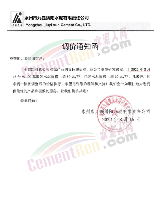 永州市九嶷驕陽水泥有限責(zé)任公司通知于2022年8月15號9∶00起散裝水泥價格上調(diào)50元/噸,包裝水泥價格上調(diào)10元/噸,凡未進(jìn)廠的車輛一律按調(diào)整后的價格執(zhí)行!