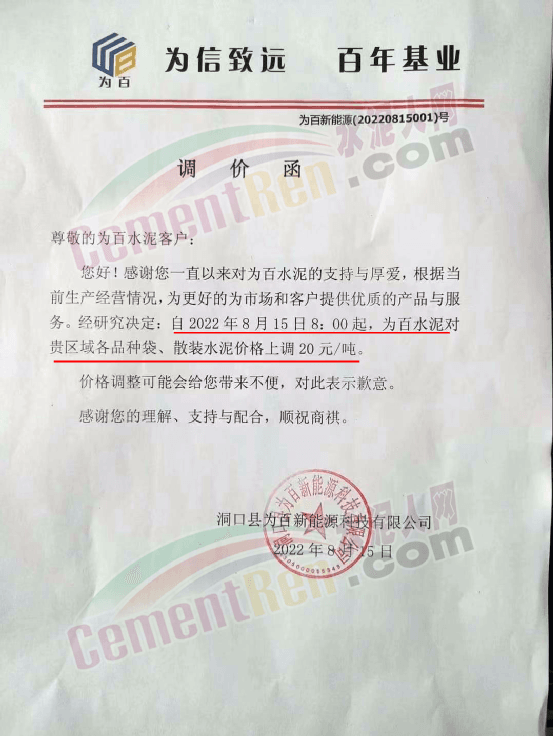 湖南洞口縣為百新能源科技有限公司通知,根據(jù)當(dāng)前生產(chǎn)經(jīng)營情況,自8月15日8時起,為百水泥對各品種袋、散裝水泥價格上調(diào)20元/噸。