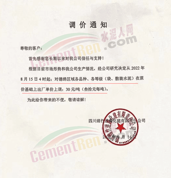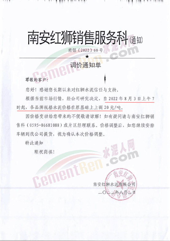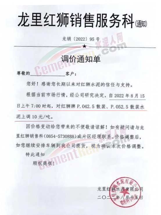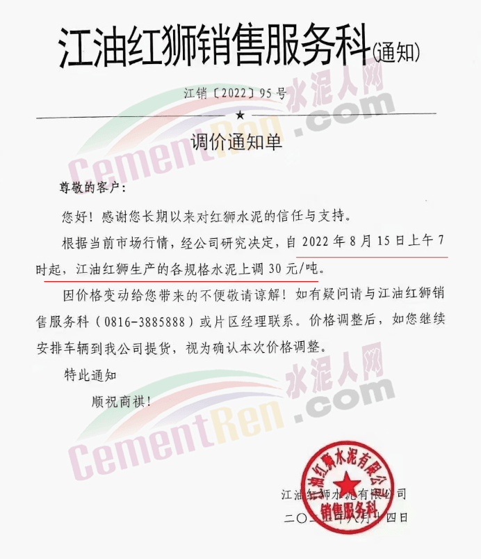 江油紅獅銷售服務(wù)科通知,根據(jù)當(dāng)前市場行情,經(jīng)公司研究決定,自2022年8月15日上午7時起,江油紅獅生產(chǎn)的各規(guī)格水泥上調(diào)30元/噸。價格調(diào)整后,如您繼續(xù)安排車輛到我公司提貨,視為確認(rèn)本次價格調(diào)整。
