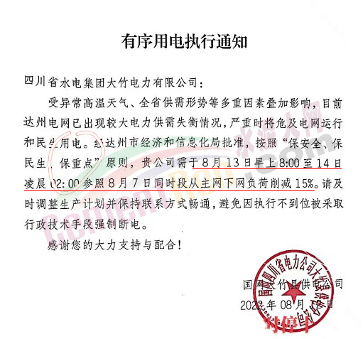 四川省水電集團(tuán)大竹電力有限公司發(fā)布《有序用電執(zhí)行通知》稱,受異常高溫天氣、全省供需形勢等多重因素疊加影響,目前達(dá)州電網(wǎng)已出現(xiàn)較大電力供需失衡情況,嚴(yán)重時將危及電網(wǎng)運行和民生用電。經(jīng)達(dá)州市經(jīng)濟(jì)和信息化局批準(zhǔn),按照“保安全、保民生(保重點”原則,貴公司需于8月13日早上8∶00至14日凌晨2∶00參照8月7日同時段從主網(wǎng)下網(wǎng)負(fù)荷削減15%。請及時調(diào)整生產(chǎn)計劃并保持聯(lián)系方式暢通,避免因執(zhí)行不到位被采取行政技術(shù)手段強(qiáng)制斷電。