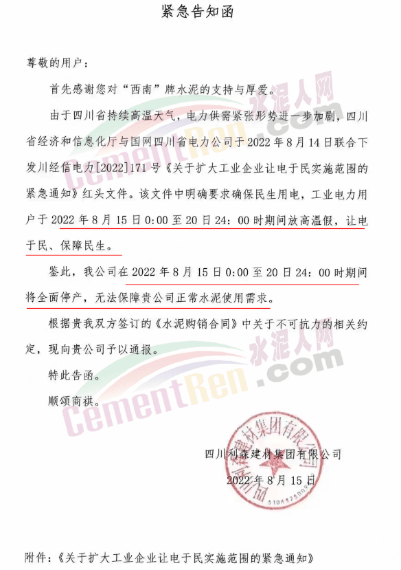 四川峨眉山西南水泥有限公司發(fā)《緊急告知函》稱,由于四川省持續(xù)高溫天氣,電力供需緊張形勢進(jìn)一步加劇,四川省經(jīng)濟(jì)和信息化廳與國網(wǎng)四川省電力公司于2022年8月14日聯(lián)合下發(fā)川經(jīng)信電力[2022]171號《關(guān)于擴(kuò)大工業(yè)企業(yè)讓電于民實施范圍的緊急通知》紅頭文件,該文件明確要求確保民生用電,工業(yè)電力用戶于2022年8月15日00:00時至20日24:00時間高溫假,讓電于民。鑒此,公司在2022年8月15日00:00時至20日24:00時期間將全面停工停產(chǎn)。