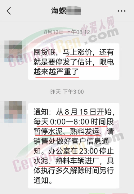 海螺水泥提醒經(jīng)銷商,“囤貨哦,馬上漲價,還有就是要停發(fā)了估計,限電越來越嚴(yán)重了。”并發(fā)出通知稱:“從8月15日開始,每天0時至8時時間段暫停水泥、熟料發(fā)運,請銷售處做好客戶信息通知。辦公室在23∶00停止水泥、熟料車輛進(jìn)廠,具體執(zhí)行多久解除時間另行通知。”