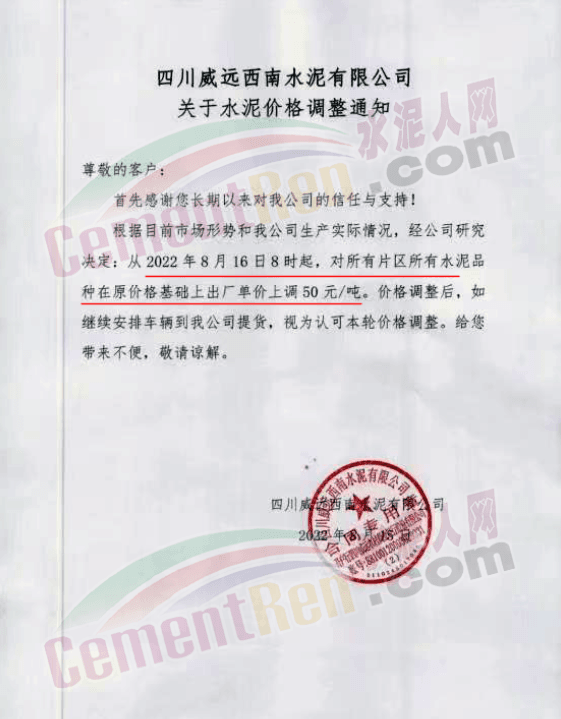 資中西南水泥通知,自8月16日8時起,對所有品種水泥價格上調(diào)50元/噸。