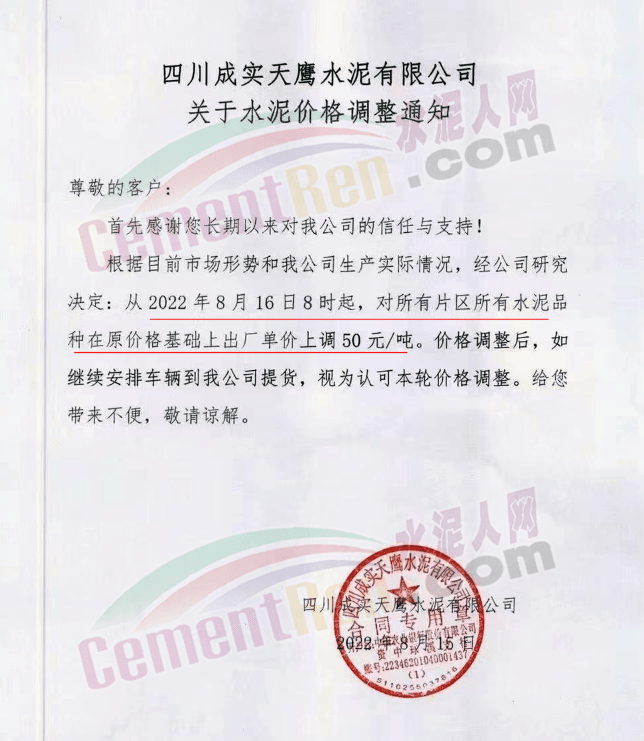 四川成實天鷹水泥通知,自8月16日8時起,對所有片區(qū)所有水泥品種在原價基礎(chǔ)上上調(diào)50元/噸。