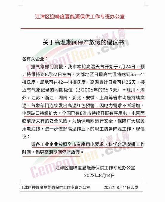 重慶江津區(qū)迎峰度夏能源保供工作專班辦公室發(fā)布《關(guān)于高溫期間停產(chǎn)放假的倡議書》給各有關(guān)企業(yè)稱∶據(jù)氣象部門測報,重慶市本輪高溫天氣開始于7月24日,預(yù)計將維持到8月23日左右,大部地區(qū)日最高氣溫將達(dá)到35—41 攝氏度,局地可達(dá)42——44攝氏度,高溫累計日數(shù)可達(dá)33天,接近有氣象記錄的同期極值(即2006年的36.9天)。
