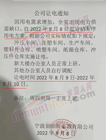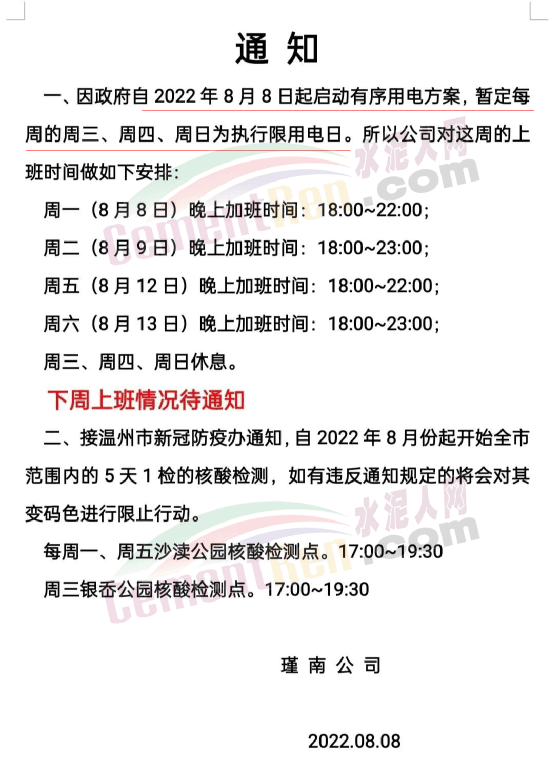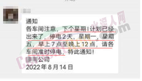 區(qū)域內(nèi)一家水泥企業(yè)緊急通知,因近期確保民生用電,導(dǎo)致水泥廠錯峰停電無法正常生產(chǎn)水泥,特此通知!從2022年8月16日00:00起所有水泥在原有基礎(chǔ)上上調(diào)50元/噸。同時水泥廠裝貨較為困難(無法磨熟料),預(yù)計散裝預(yù)計進(jìn)廠排隊等待時間大于20小時(無法確是否能裝到),為保證前場供給,麻煩各位客戶一定要合理安排,預(yù)估送貨時間及前場水泥使用情況,避免不必要的斷料。該情況預(yù)計需要一周以后才能根據(jù)供電量情況是否有所好轉(zhuǎn)。