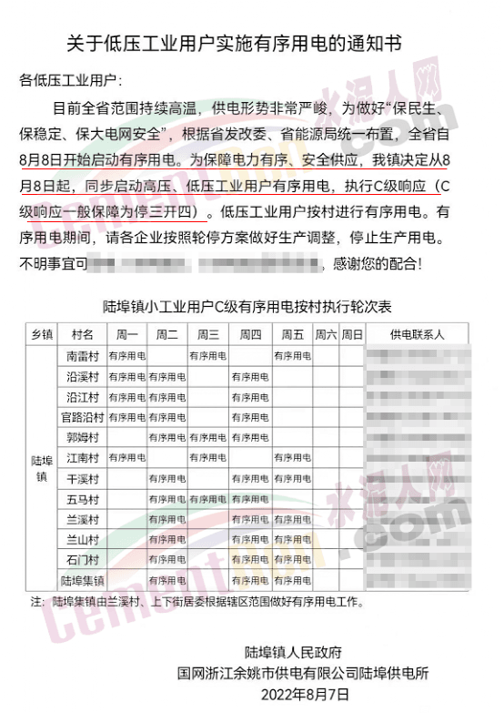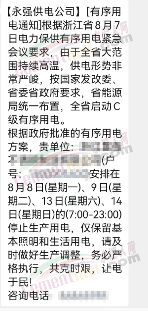 8月初,浙江省發(fā)改委發(fā)布《關(guān)于同意啟動C級有序用電的函》給國網(wǎng)浙江電力有限公司稱,經(jīng)請示省政府同意,浙江省8月8日根據(jù)用電缺口實際情況啟動C級1250萬千瓦有序用電措施,8月9日再視情況調(diào)整有序用電等級。請認(rèn)真做好有序用電細(xì)化措施,壓實各地責(zé)任,確保民生用電,絕不能拉閘限電。