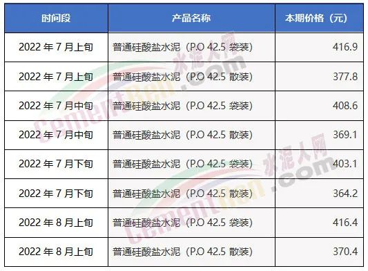 國家統計局數據顯示8月上旬水泥價格P.O42.5散裝水泥報價370.4元/噸,包裝水泥報價416.4元/噸。環比7月下旬散裝水泥上漲了6.2元/噸,包裝水泥上漲了13.3元/噸。但是,相比今年1月下旬,前七個月內下跌超100元/噸。
