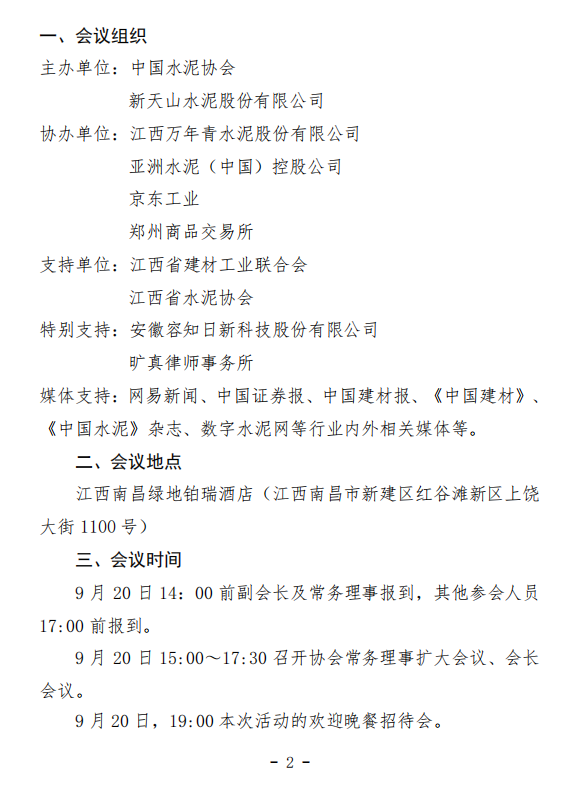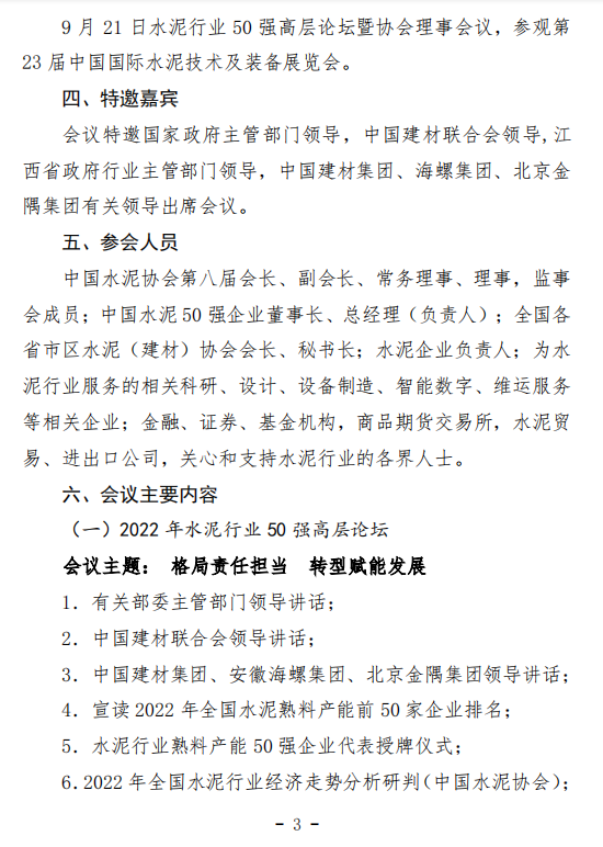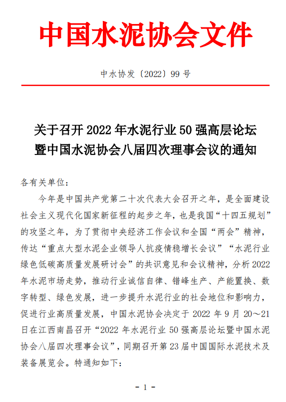 今年是中國共產黨第二十次代表大會召開之年,是全面建設社會主義現代化國家新征程的起步之年,也是我國“十四五規劃”的攻堅之年,為了貫徹中央經濟工作會議和全國“兩會”精神,傳達“重點大型水泥企業領導人抗疫情穩增長會議”“水泥行業綠色低碳高質量發展研討會”的共識意見和會議精神,分析2022年水泥市場走勢,推動行業誠信自律、錯峰生產、產能置換、數字轉型、綠色發展,進一步提升水泥行業的社會地位和影響力,促進行業高質量發展,中國水泥協會決定于2022年9月20~21日在江西省南昌市召開“2022年水泥行業50強高層論壇暨中國水泥協會八屆四次理事會議”,同期召開第23屆中國國際水泥技術及裝備展覽會。