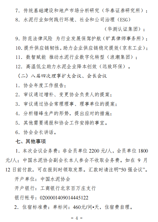 1.本次會議會務費:非會員單位2200元/人,會員單位1800元/人;中國水泥協會副會長本人參會不收取會務費。如在9月12日前付款,可在報到時領取發票。匯款時請注明“50強會議”。