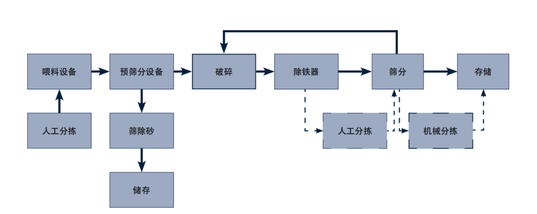 而建筑垃圾本身可以作為砂石骨料生產的半成品直接進行利用,簡單來講,要想將建筑垃圾在建材產業鏈中變廢為寶,只需做好“篩分+破碎”這兩大工序即可。