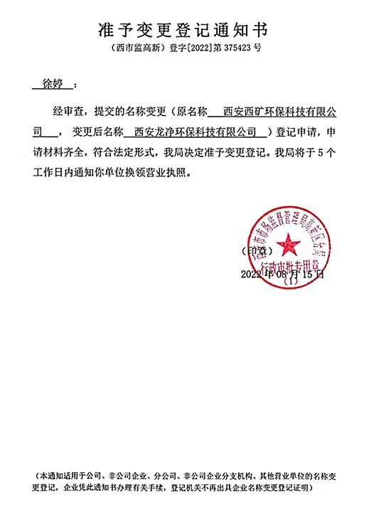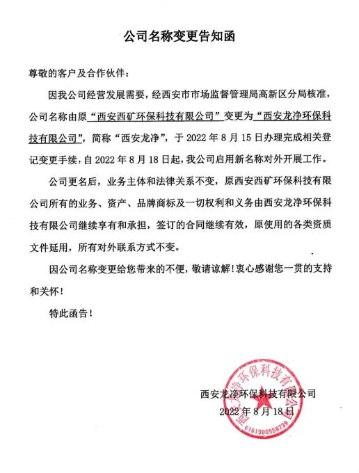 因企業(yè)經(jīng)營發(fā)展需要,經(jīng)西安市市場監(jiān)督管理局高新區(qū)分局核準,企業(yè)名稱由原“西安西礦環(huán)??萍加邢薰?rdquo;變更為“西安龍凈環(huán)??萍加邢薰?rdquo;,簡稱“西安龍凈”,于2022年8月15日辦理完成相關(guān)登記變更手續(xù),自2022年8月18日起,企業(yè)啟用新名稱對外開展工作。