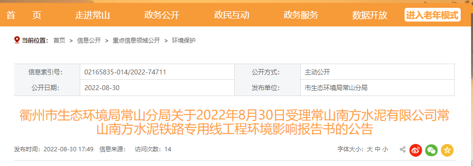 浙江省衢州市生態環境局常山分局發布《關于2022年8月30日受理常山南方水泥有限公司常山南方水泥鐵路專用線工程環境影響報告書的公告》