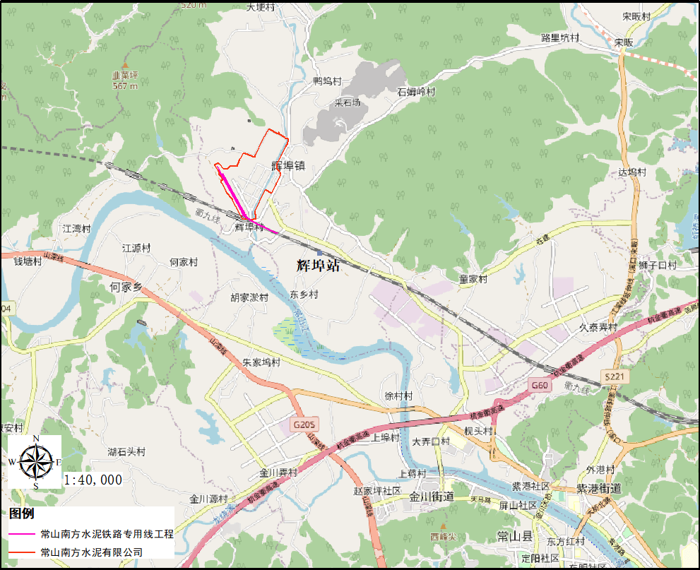 2022年5月19日,浙江省發展和改革委員會核準了本工程,項目名稱“常山南方水泥鐵路專用線工程”,項目代碼2205-330000-04-01-161771。本工程在現有鐵路九景衢鐵路的輝埠站九江端接軌,沿九景衢鐵路的北側向西布線至廠區,全長約1.79km,采用專用線標準。輝埠站九江端約270m范圍調整軌道增設道岔,輝埠站與廠區之間約345m新建專用線,進廠后利用預留用地設廠區站。廠區站用于原煤卸車和水泥裝車。本專用線設計運量為170萬噸/年,本次專用線工程不改變廠區原有產能。
