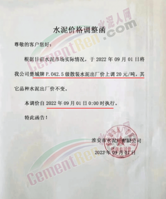 據水泥人網了解,自8月下旬南京、鎮江地區個別企業通知上調散裝價格10-20元/噸后,近兩日江蘇揚州、泰州、鹽城、淮安主要品牌企業跟漲15-20元/噸。