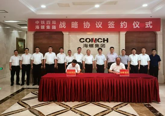 中鐵四局副總經理、總經濟師朱曉勇與海螺集團總經濟師丁鋒代表雙方簽署協議