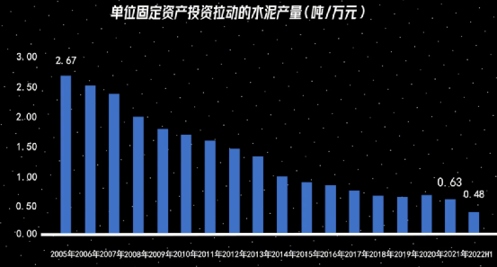 這一結論我們可以用一個指標來驗證,單位固定投資產投資拉動的水泥產量。從歷史數據來看,每萬元固定資產投資需要的水泥量,已經從2005年的2.67噸下降至2021年的0.63噸。并且2022年上半年繼續下滑至0.48噸,這一遞減規律也是符合常理的。