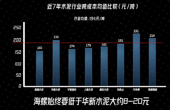 海螺的噸成本優勢非常明顯,近7年每噸成本的平均值為165元,比行業的平均值要低29元。對比海螺水泥和華新水泥的噸成本構成,自2013年起,每噸水泥的煤炭成本,海螺水泥始終要低于華新水泥8-20元。