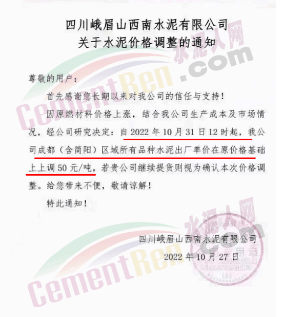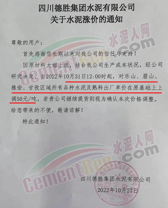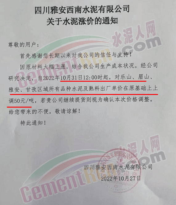 雅安西南、二郎山喇叭河水泥、德勝集團、皓宇水泥通知10月31日12時起,對樂山、眉山、雅安、甘孜區域水泥及熟料價格上調50元/噸。峨眉山西南水泥通知10月31日12時起,成都(含簡陽)區域水泥價格上調50元/噸。
