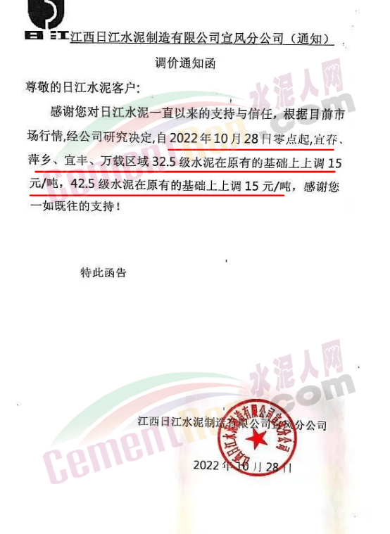 江西日江水泥通知,10月28日 零點起宜春、萍鄉、宜豐、萬載區水泥價格上調15元/噸。