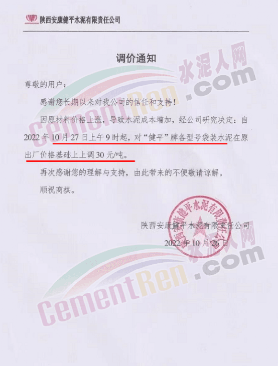 安康健平水泥通知,10月27日9時起,水泥價格上調30元/噸。