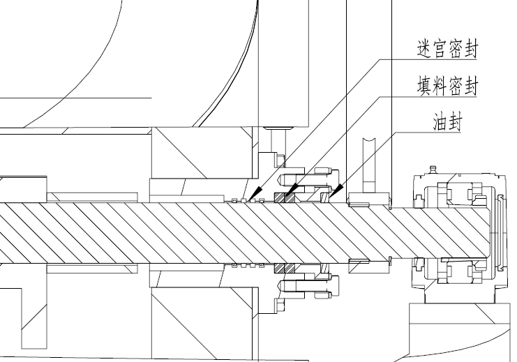 針對(duì)上述問(wèn)題,HJ新型翻板閥設(shè)計(jì)思路是將密封和轉(zhuǎn)動(dòng)兩個(gè)相互矛盾問(wèn)題拆開后分別處理。由內(nèi)而外設(shè)置迷宮、填料、油封三層密封結(jié)構(gòu)(見(jiàn)圖3)。其中迷宮、油封結(jié)構(gòu)不直接與轉(zhuǎn)動(dòng)軸接觸,迷宮結(jié)構(gòu)內(nèi)部設(shè)置引流環(huán),可提前大幅度卸去沖擊到填料上面的瞬時(shí)正壓,由于接觸填料的瞬時(shí)正壓變低,填料密封的效果更加顯著。設(shè)置在最外端的油封既可以減少外部粉塵進(jìn)入填料,也可以再次降低漏料幾率。