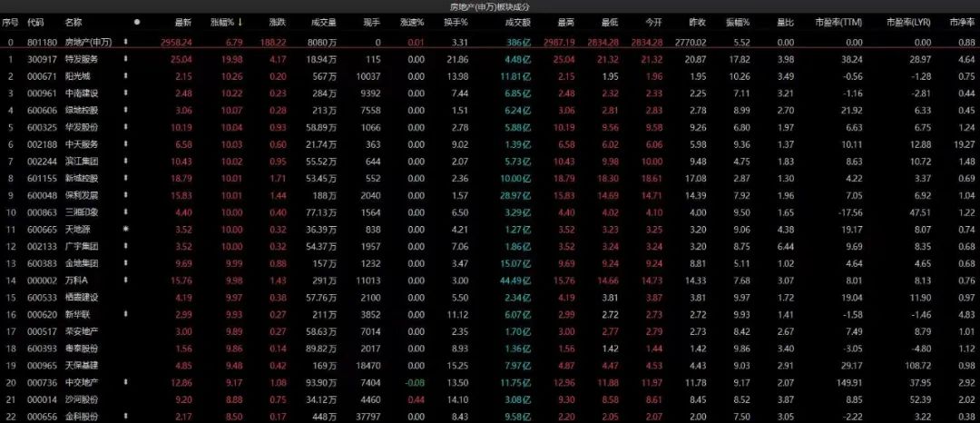 同時,房地產相關產業鏈全線高開,房地產開發、房地產服務、水泥建材、裝修裝飾、工程咨詢服務、家電、銀行等板塊表現搶眼,租售同權、REITS等題材板塊表現活躍。