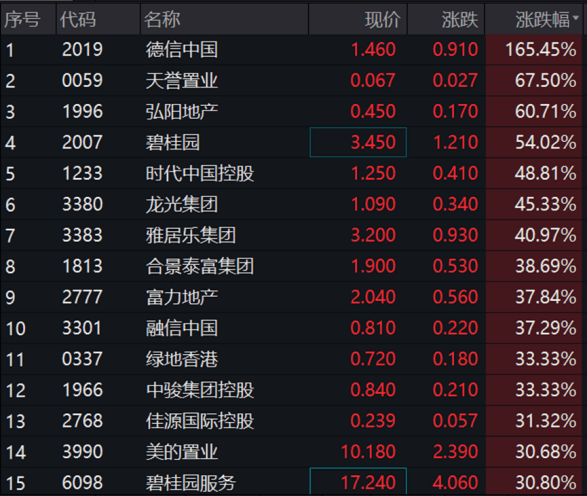 11月14日,內地房地產指數漲超10%。德信中國漲超165%,天譽置業、弘陽地產漲超60%,碧桂園漲54%,時代中國控股、龍光集團、雅居樂集團漲超40%,富力地產、融信中國漲超35%,美的置業新城控股、龍湖集團漲超20%。