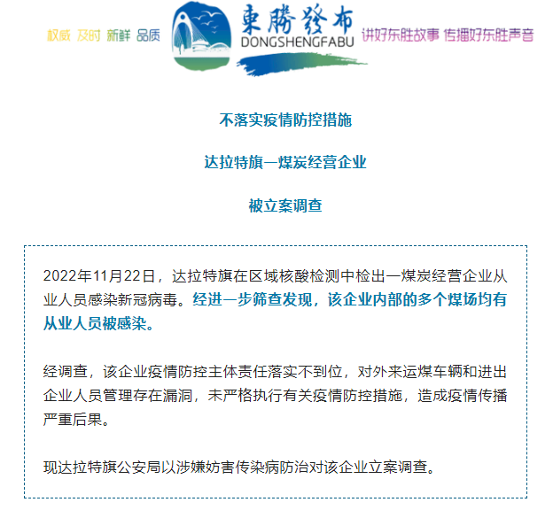 2022年11月22日,內蒙古達拉特旗在區域核酸檢測中檢出一煤炭經營企業從業人員感染新冠病毒。經進一步篩查發現,該企業內部的多個煤場均有從業人員被感染。