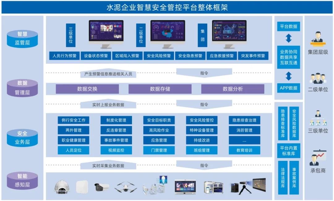 水泥企業智慧安全管控平臺,以雙重預防機制和安全生產標準化為核心,采用“平臺+移動APP+智能終端”的創新管理模式,對企業安全風險及隱患排查等重要環節采用動態閉環式管控,協助水泥企業構建集團、二級單位、三級單位等多層級的安全管控模式,融合三維地圖、人車定位、智能視頻監控、智能門禁等智能軟硬件設施,實現水泥企業安全工作的關口前移、精準監控、源頭治理、科學預防和智能化管控,從而加強對水泥企業生產過程中安全風險進行全面有效管控。