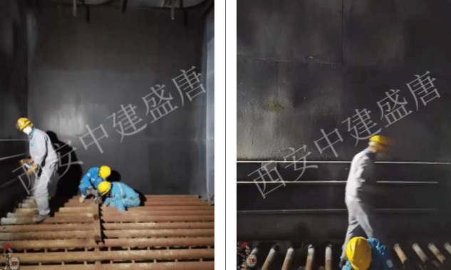 2020年7月,西安中建盛唐首先對水泥廠的二線窯尾收塵器內壁腐蝕部位使用TD104#石墨烯防腐涂料進行防腐施工。在使用3個多月后,對窯尾袋收塵氣室運行情況進行檢查,效果良好:檢查 10 個凈氣室5個面防腐涂料防腐效果良好,完整無腐蝕脫落現象;10個凈氣室東、西側及頂部三個面結晶現象較嚴重,清理結晶物后,防腐層完整,未滲透防腐涂料,防腐效果良好。