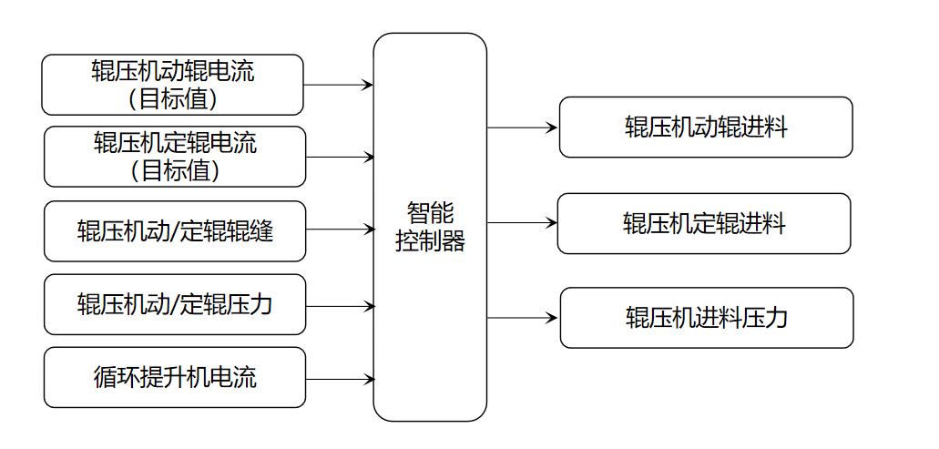 輥壓機負荷控制是根據輥壓機電流目標值自動調節喂料擋板,以保證輥壓機電流在正常范圍內。輥壓機電流反映輥壓機碾壓物料的多少,輥壓機電流不能過高。通過輥壓機喂料擋板自動控制穩定輥壓機滾壓物料量,從而穩定輥壓質量和產量,并且保證輥壓機電流不超過設定限值。