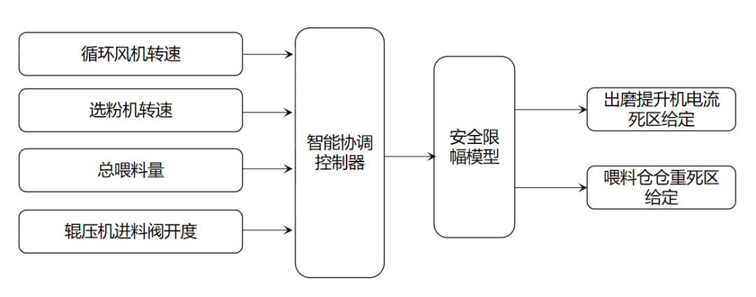 出磨提升機電流及穩流倉倉重的平穩控制是水泥磨平穩生產的核心,但這兩個指標存在較多的共同影響因素,單一的設定值有可能導致在實現上述回路的常規控制后,形成內部持續波動,在此需要對兩者進行協調。同時,穩流倉倉重控制的主要目的是使進入喂料倉的物料與進入輥壓機的物料達到一個相對平衡的狀態,以便輥壓機能夠工作在最佳狀態并且不會對輥壓機造成太大的沖擊,既可以使輥壓機運轉穩、利用率提高,也可以延長其使用壽命。