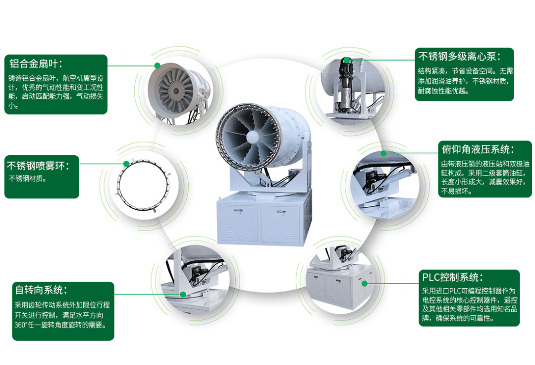 2 噴出的霧粒細小,與粉塵接觸時,形成一種潮濕霧狀體,能快速將粉塵抑制;