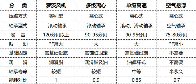 空浮風(fēng)機(jī)比傳統(tǒng)羅茨風(fēng)機(jī)節(jié)能25%~35%,比多級離心風(fēng)機(jī)節(jié)能10%~20%,是目前最節(jié)能、最高效的高速流體設(shè)備。