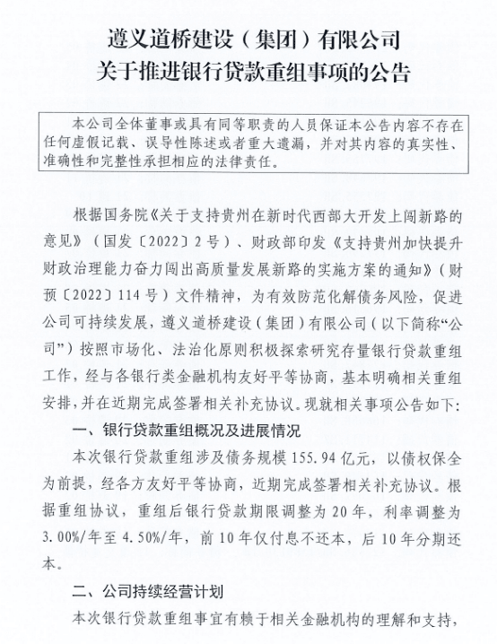 近日,貴州遵義最大城投——遵義道橋建設(shè)(集團)有限公司(下稱“遵義道橋”)披露的銀行貸款重組方案引起廣泛關(guān)注。根據(jù)重組協(xié)議,155.94億元銀行貸款重組后期限調(diào)整為20年,利率調(diào)整為3%/年~4.5%/年,前10年僅付息不還本,后10年分期還本。近156億元銀行債務(wù)展期至20年實屬罕見。
