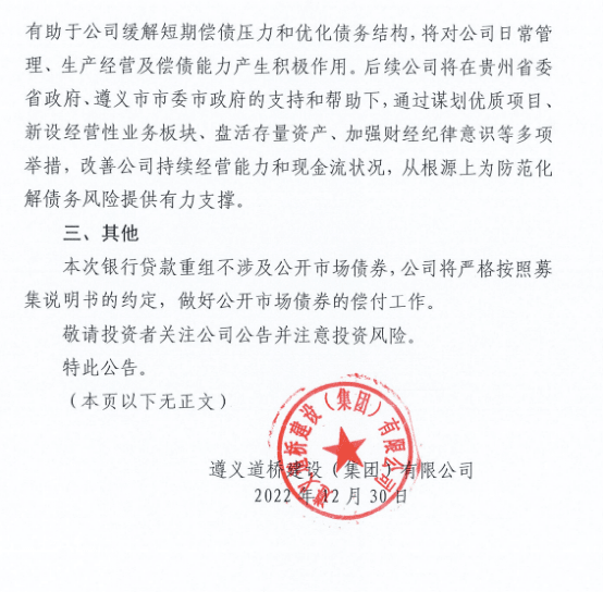 值得注意的是,本次銀行貸款重組不涉及遵義道橋公開市場債券。目前遵義道橋存續(xù)債券29只,存續(xù)規(guī)模170.72億元,兌付期主要集中在3-5年內(nèi)。此外,遵義道橋還存續(xù)3只美元債,存續(xù)規(guī)模2.69億美元,均將于2025年到期。