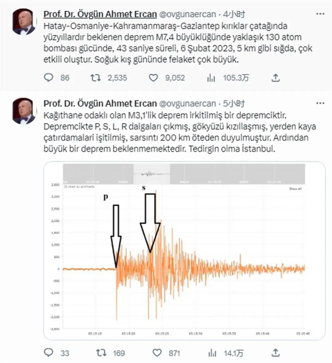 地震發生后,土耳其地震專家艾哈邁德·奧文·埃爾詹在推特上表示,地震發生的地方在四個主要斷裂帶的交界處,威力約為130顆原子彈持續爆炸了43秒。