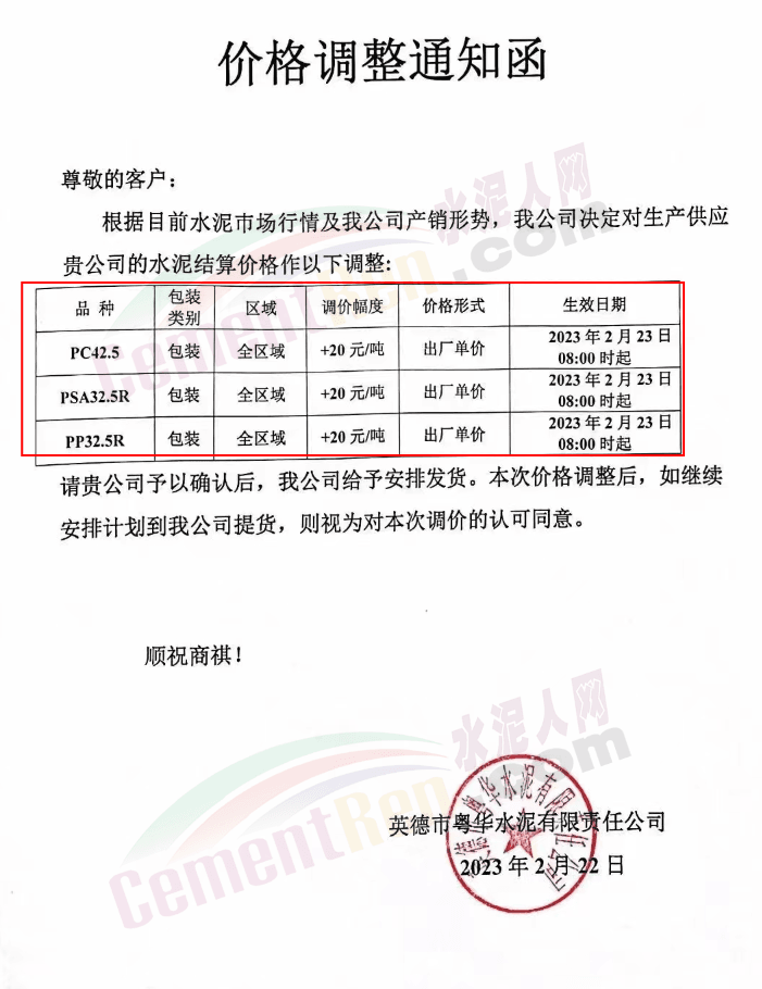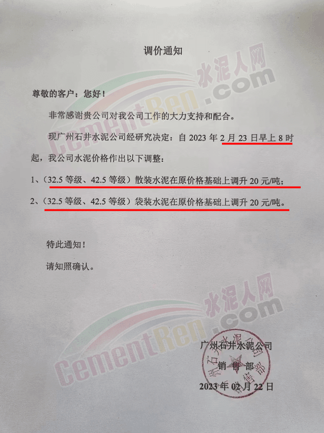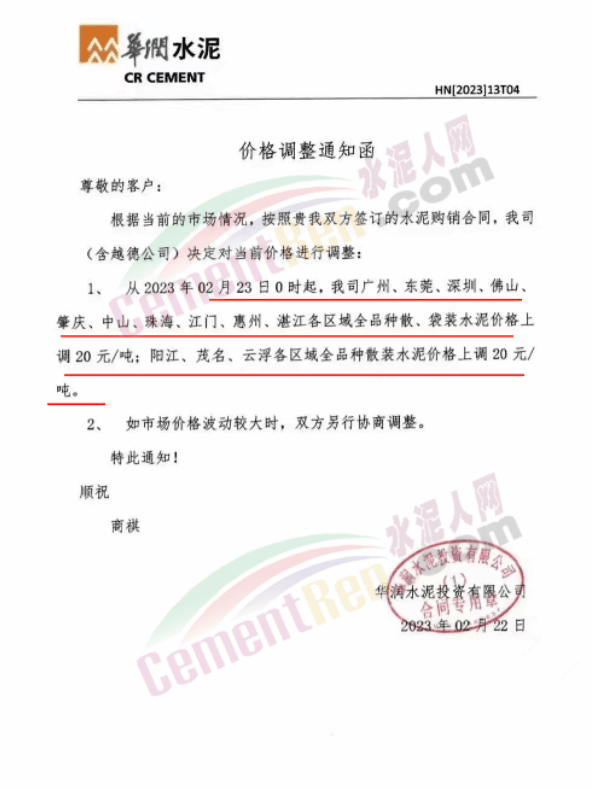華潤水泥通知從2023年2月23日0時起,廣州、東莞、深圳、佛山、肇慶、中山、珠海、江門、惠州、湛江各區域全品種散、袋裝水泥價格上調20元/噸;陽江、茂名、云浮各區域全品種散裝水泥價格上調20元/噸;潮汕、揭尾銷售區域全品種散裝水泥價格上調20元/噸,全品種袋裝水泥價格上調10元/噸。